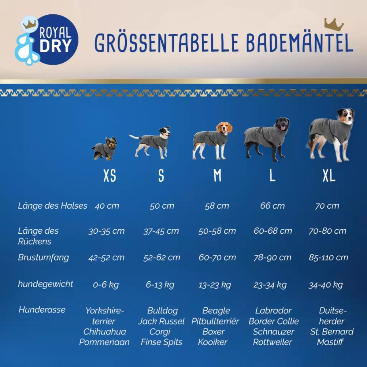 Dieser super saugfähige Bademantel aus Mikrofaser saugt Wasser auf wie ein Schwamm. Er hält Ihren Hund herrlich warm und verhindert, dass Ihr Auto, Ihr Haus oder Ihre Möbel nass und schmutzig werden. Dank der verschiedenen Größen, des verstellbaren Halskragens und der Klettverschlüsse können Sie für fast jeden Hund den perfekten Bademantel finden. Darüber hinaus ist der Bademantel für alle Fellarten geeignet. Der Royal Dry Bademantel ist extrem strapazierfähig, superweich und nimmt keine Gerüche auf. Außerdem ist der Bademantel antibakteriell und trocknet sehr schnell.